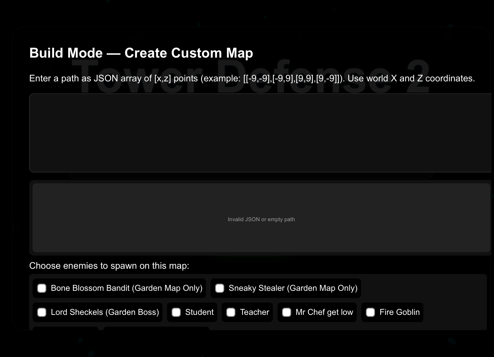 The build mode feature in Froy’s tower defense 2 uses JSON to make maps, there is also a feature to add the enemies the player adds, in this box includes every enemy in the game from every map that is selectable to be in the players map this also includes bosses.