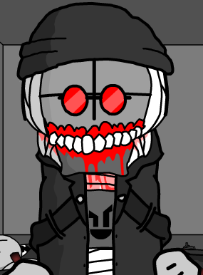 After Demon Tricky kills Hank, he was revived with supernatural means with a new appearance. He now has a lighter complexion, has his coat zipped up, a bandana around his mangled-up mouth, fingerless gloves, and wears black goggles with red lenses, this is Hank's most iconic appearance in the Madness' series. He spends most of the episode running from Demon Tricky, until he manages to damage Tricky's Improbability Drive, which causes Tricky to be much weaker. He also finds and manages to kill Mag Agent: Torture, the first of the mag agents and for the first time encounters A.T.P. engineers. At the end of the episode, Jesus stabs him with his binary sword and executes him with his S&W 500. This version of Hank is the most commonly used version of Hank outside the canonical series, being seen in the incident series, artwork, many fan animations, and the Project Nexus series.