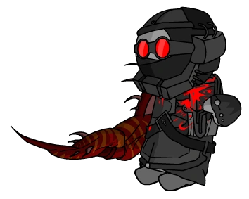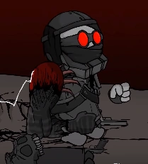 Hank then slaughters more AAHW units next to a grunt similar to the grunt at the beginning of 9.5 pt1. He attempts to grab the grunt, but the grunt starts rapidly shaking, floating away and then slamming into the ground as Tricky emerges and starts gravitating towards an AAHW facility. As Hank enters the Facility, Trick is found creeping within the floor behind several units. Hank quickly eliminated all of the units before striking Tricky in the head with a falchion. Tricky cries out in anger, and attacks Hank. Tricky summons a giant bloodied skeletal version of himself, right before taking a hit from Hank. The demon tries attacking Hank but quickly stopped because a Retainer comes out and battles Hank which was defeated quickly. Tricky intervenes and forces the Retainer into a wall, before leaving Hank to deal with the Retainer.