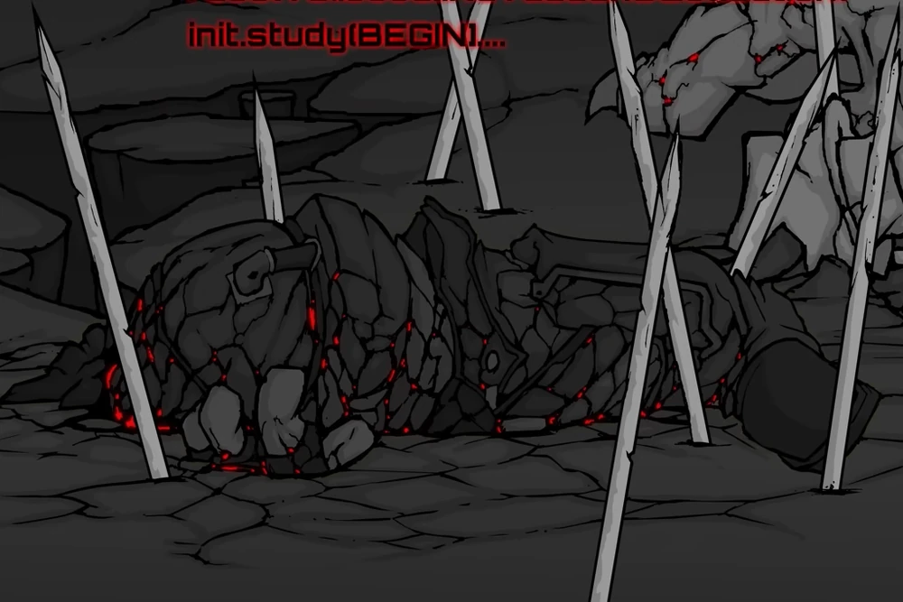 After the brief mention. The screen quickly fades in and Mag-Hank is shown physically where he is still curbed into the ground in the aftermath of the final moments of Madness Combat 11. His body is illustrated to be covered in some sort of black tar-like substance which contains various red spots. Some more programming appears above him for a brief moment before turning into giant ERROR which then morphs into a message: