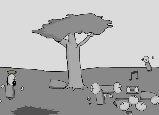 When Jesus realizes his zombies do not offer enough offensive power, he pushes the bodies away, then decides to summon a cannon and fires a few shots at Hank, which he dodges by ducking and jumping. While trying to shoot hank, Jesus is then caught off guard and then shot by Hank's MAC-10. Several more people begin charging at Hank, who now uses PPKs, knives and a sawed-off shotgun to take them out. After killing all his foes, Hank brings the boombox to him and shoots the dancing man in the background. Being the only living character left in the animation, Hank dances to the music and a text appears on the screen: