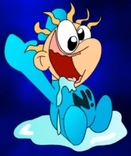 Nathaniel has pale skin, no teeth, big miss-shaped eyes like his father, black eyes with smaller white pupils, 6 strands of yellow hair, a blue onesie with his initial, N with an exclamation mark next to it, and he is sitting in his pool of saliva.