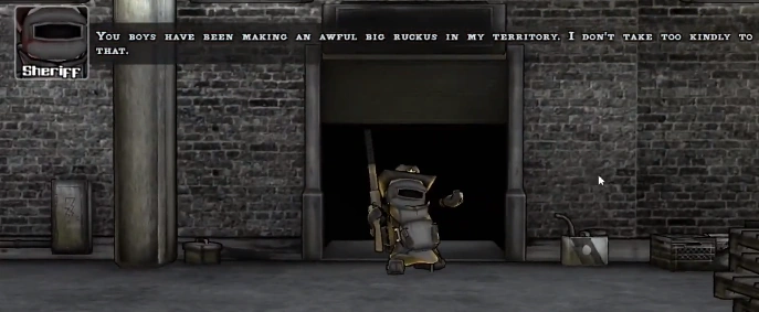 The Sheriff's first appearance in campaign mode is in "The Station Fortress," where he battles Sanford and Deimos from across a gap while wearing heavy armor. Known for his deadly combat skills, the Sheriff proves to be a formidable opponent if left unchecked. Armed with dual-wielded BM38 Ls and a .38 Magnum, he possesses infinite ammunition for these weapons. Moreover, his exceptional speed and large Tac-Bar make him difficult to hit with conventional firearms. The Sheriff consistently engages in revolver firefights and exhibits quick reloading abilities. After sustaining enough damage, he retreats and reappears when Sanford & Deimos reach the rooftops. The duo must chase him down and corner him before fighting him again. Unlike Hank, Sanford and Deimos do not kill him but convince him to unlock the transit network, to which he agrees. Before leaving, he warns the duo that even though he no longer harbors hostility towards them, MERC is furious at them for the damage they've inflicted on their ranks and will seek revenge.