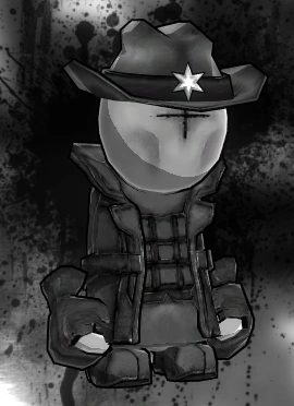 The Sheriff's appearance aligns with the stereotypical image of a sheriff, obviously. He sports a distinctive cowboy hat, brown marksman gloves and a leather coat with a brown vest underneath. The Sheriff's facial features include prominent cheekbones with noticeable indentations. His facial cross also appears to be significantly smaller.